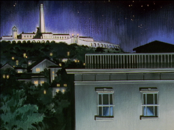 Stock establishing shots of the tower tell us about the time. At night, the shadows run to the left for illusion in Akio’s corrupt darkness, and the red floor is partly purple for corruption. During the day, they run to the right.